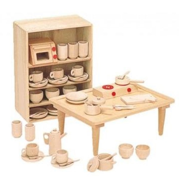 ブナ材を使った本格的なままごとあそびセットで、収納箱が食器棚に、フタがテーブルになります。木の素材感とその温もりが、「ごっこ遊び」の中で創造力を高めてくれます。かわいいおかあさんが野菜をトントン、レンジでピッ。テーブルにはたくさんのごちそうが並びます。